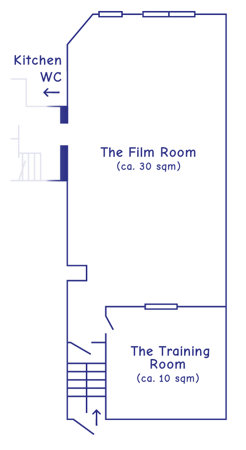 - Two rooms with sofas, desks, TV and white board, kitchenette and WC. See floor plan below. Coffee and tea are included in the rent.